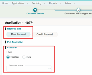 • Create Application: Click Create Application. Select Deal Request you will select a customer type, New or Existing, to proceed.
